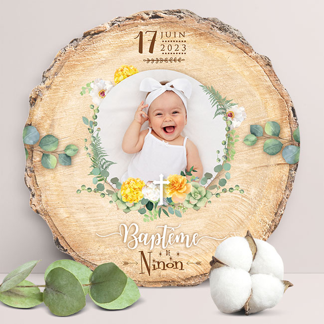Votre faire-part surprendra vos proches dès l’ouverture de l’enveloppe grâce à son format original en rondelle de bois. Loin des modèles classiques, ce support circulaire apporte une texture authentique et un relief qui souligne le caractère unique de l’événement. Le design s’appuie sur une esthétique champêtre, mariant avec douceur des fleurs de printemps jaunes et blanches et les nuances de bois. Au centre, la photo de votre enfant s’intègre naturellement dans ce décor végétal pour créer un souvenir précieux que vos invités auront plaisir à conserver.