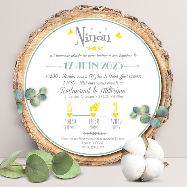 Ce faire-part de baptême bois printemps accompagne tous vos plus beaux événements