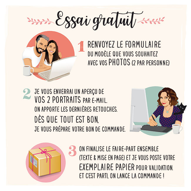 Dès validation de l’essai gratuit, je vous enverrai votre bon de commande pour vos invitations de baptême. La partie création sera à régler à ce moment-là pour poursuivre la création ensemble. Une fois cette étape terminée, la partie impression et livraison sera à régler directement à l’imprimeur à réception de votre exemplaire papier par la poste. Vous pourrez régler par virement bancaire.