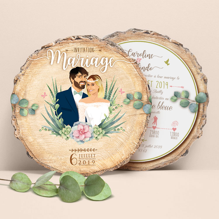 Votre faire-part surprendra vos proches dès l’ouverture de l’enveloppe grâce à son format original en rondin de bois. Loin des modèles classiques, ce modèle coupé en forme de rondelle de bois apporte une texture authentique et un relief qui souligne le caractère unique de l’événement. Le design s’appuie sur une esthétique champêtre chic, mariant avec douceur l’univers bohème et les couleurs douces beige, vert et rose pastel. Au centre, vos portraits en dessin réalisés d’après vos photos s’intègrent naturellement dans ce décor végétal pour créer un souvenir précieux que vos invités auront plaisir à conserver.