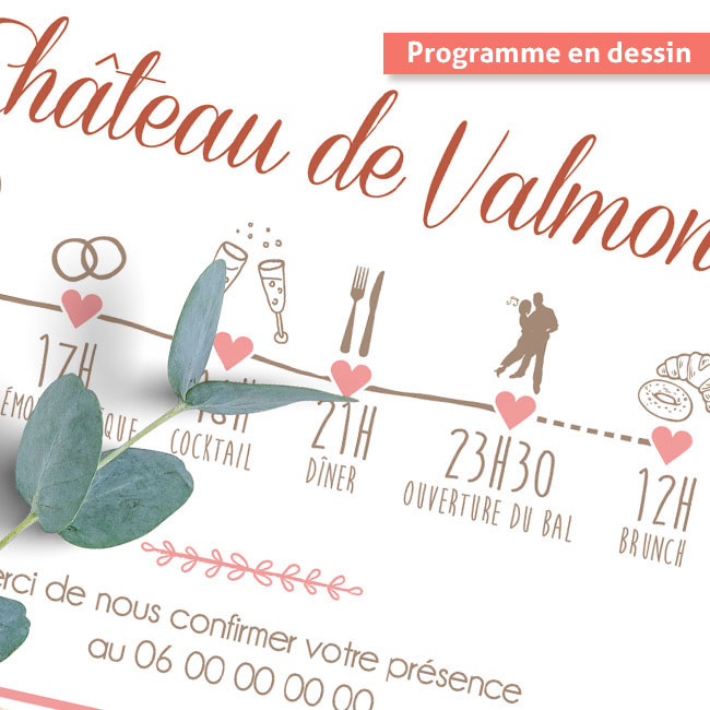 Le verso de la carte privilégie la simplicité et l’efficacité pour guider vos proches tout au long de la journée. Grâce à une série de pictogrammes sympas et modernes, le programme devient visuel : l’heure de la cérémonie, la séance photo et le moment du repas se lisent en un clin d’œil. Cette mise en page dynamique évite les blocs de texte trop denses et permet de transmettre les informations essentielles de manière fluide, tout en restant parfaitement en accord avec l’esprit léger et convivial de votre fête.
