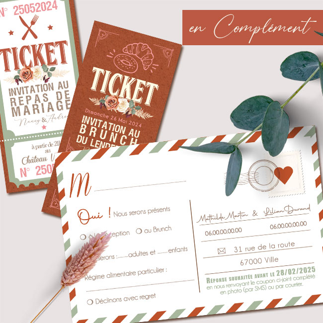 Pratiques : Ils se glissent facilement dans l’enveloppe et renforcent l’aspect collectionneur du faire-part. Il est également possible d’ajouter des coupons-réponses assortis pour une papeterie de mariage complète et cohérente.